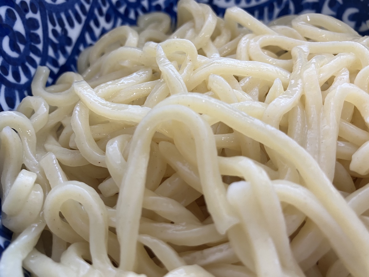 麺を冷やしているときに感じたのは、うどんのような強いモチモチ感。口にするとモッチモでありながら、喉越しが良い中太麺です。
